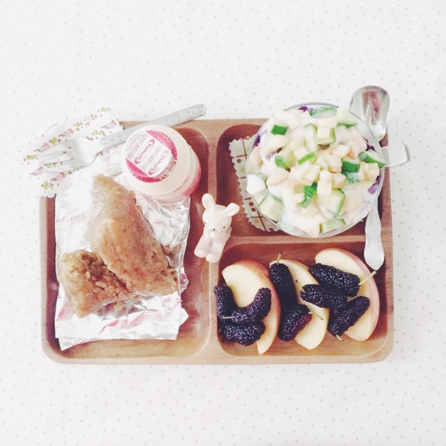 嘉兴肉粽、紫甘兰黄瓜苹果沙拉(酸奶拌的,紫甘蓝看不见啦,吃起很清爽)、苹果桑...