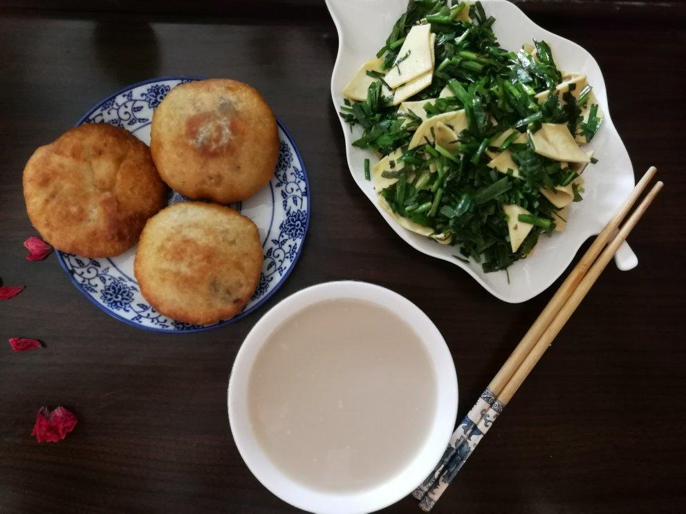 五谷豆浆+炸糕+韭菜炒豆皮!
