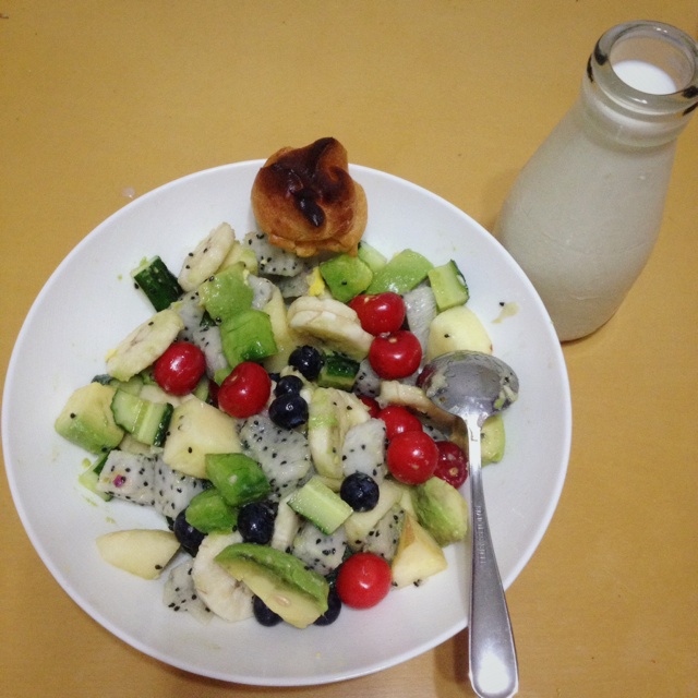 昨天被同事说发福了于是今天改吃素!!水果沙拉,把家里有的水果几乎都用上了:黄瓜、甜瓜、牛油果、火龙果、苹果...