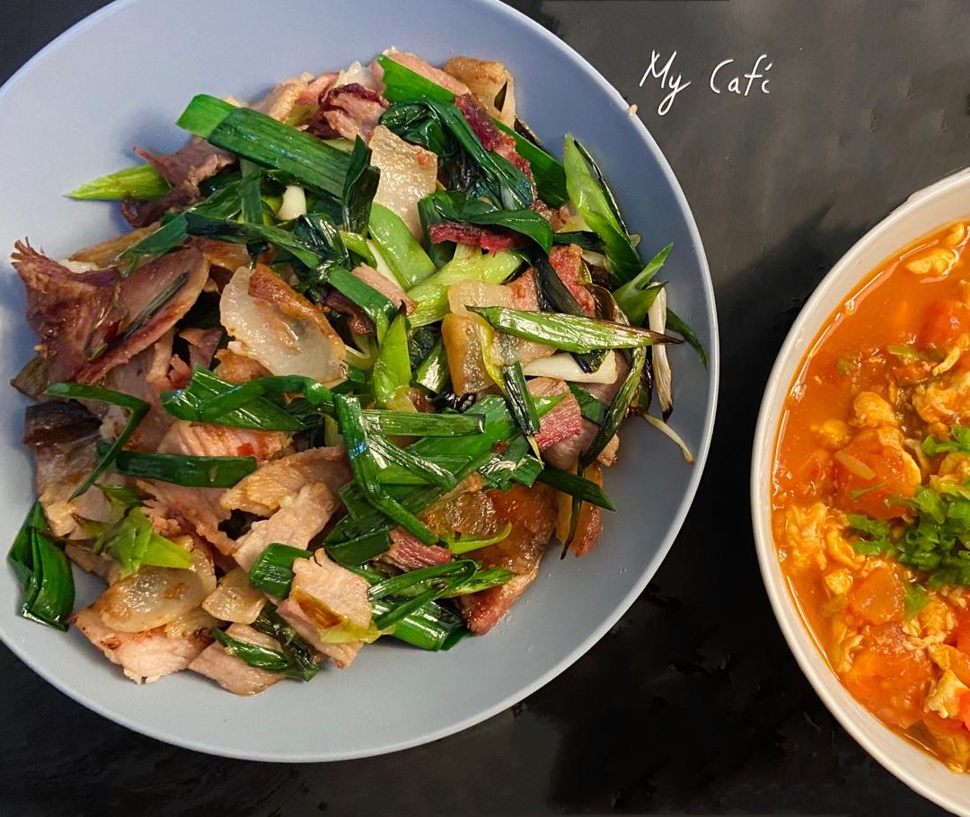 最喜欢就是浸润着肉香的蒜苗。回锅肉是家里的腊肉。真真家里的味道...