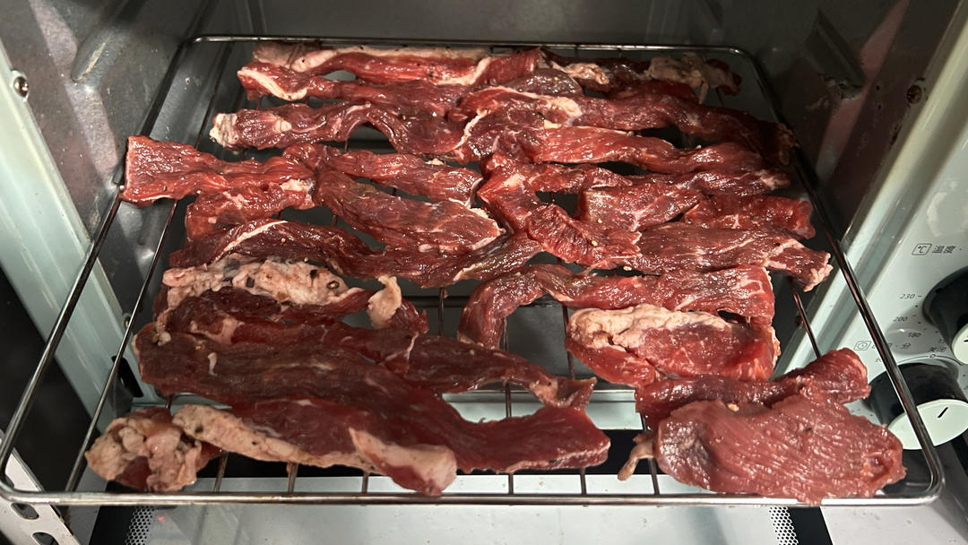 牛腿肉买回来顺着纹理切成条状,加盐生抽料酒黑胡椒五香粉腌制24个小时,放烤箱中层,上下火 150度...