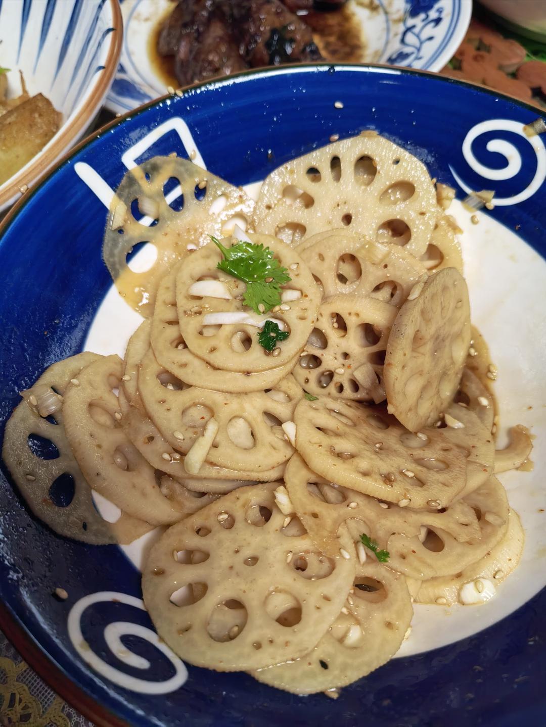 我来交作业,藕用了一节,焯水过凉真的脆。可能调料放的少,没有那么鲜亮的色泽,但真的好吃。
