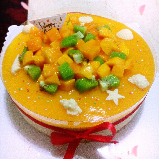 给男神做的生日蛋糕,好像芒果真的下太多啦,可是他好喜欢芒果来的(╯3╰)真的好久好久没见面了,喜欢...