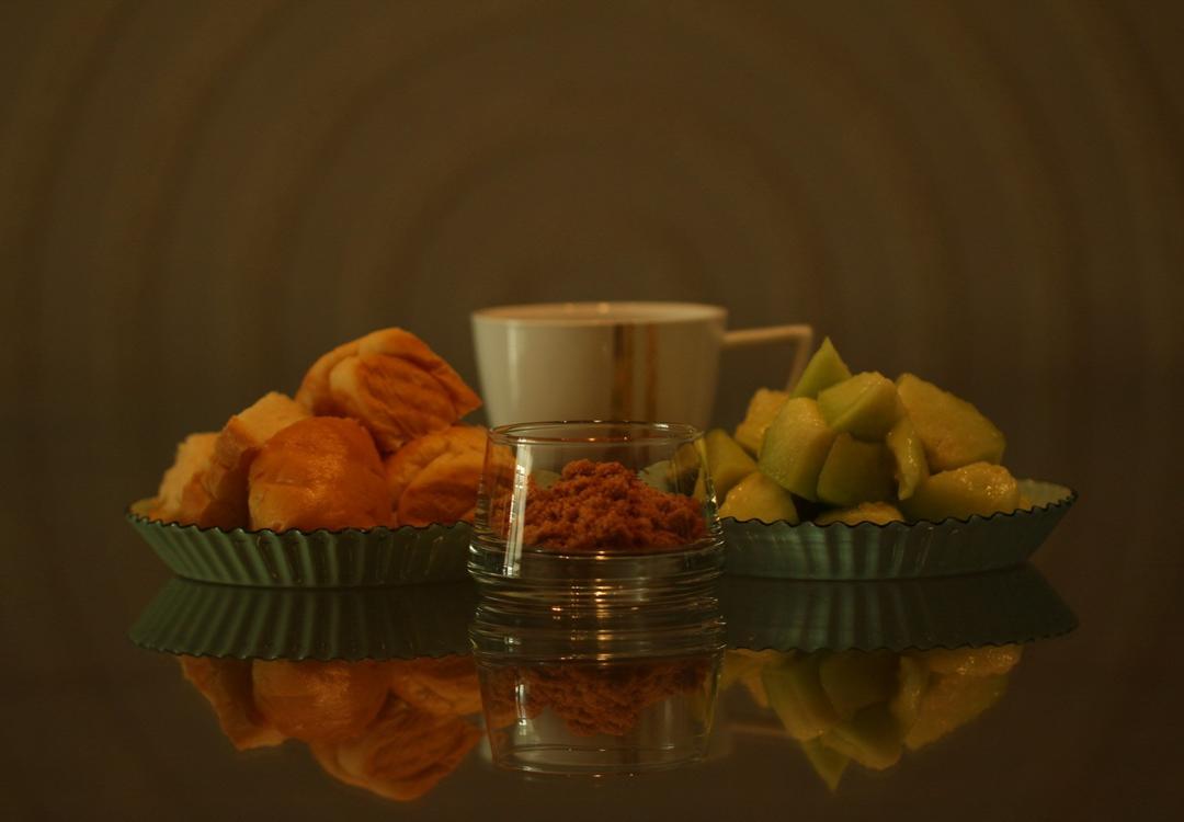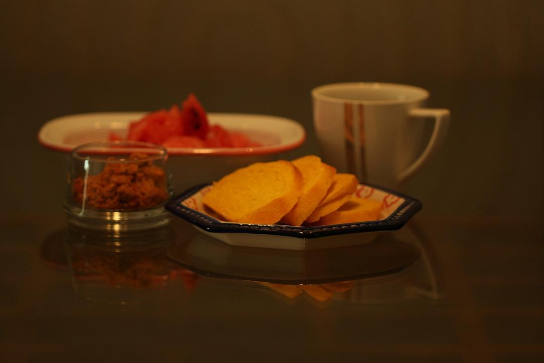 一人早饭:胡萝卜吐司,肉松,黑咖啡,网纹瓜。