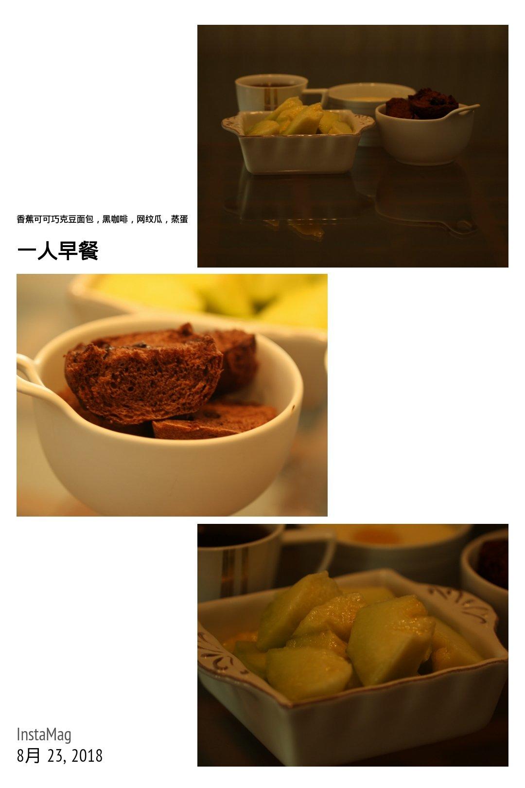 一人早饭:香蕉可可巧克力豆面包,网纹瓜,黑咖啡,蒸蛋。
