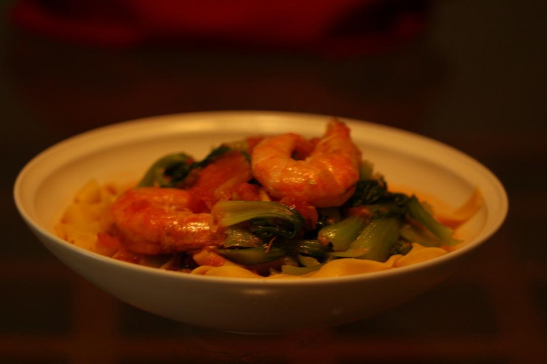 一人午饭:大虾茄汁油菜南瓜面面