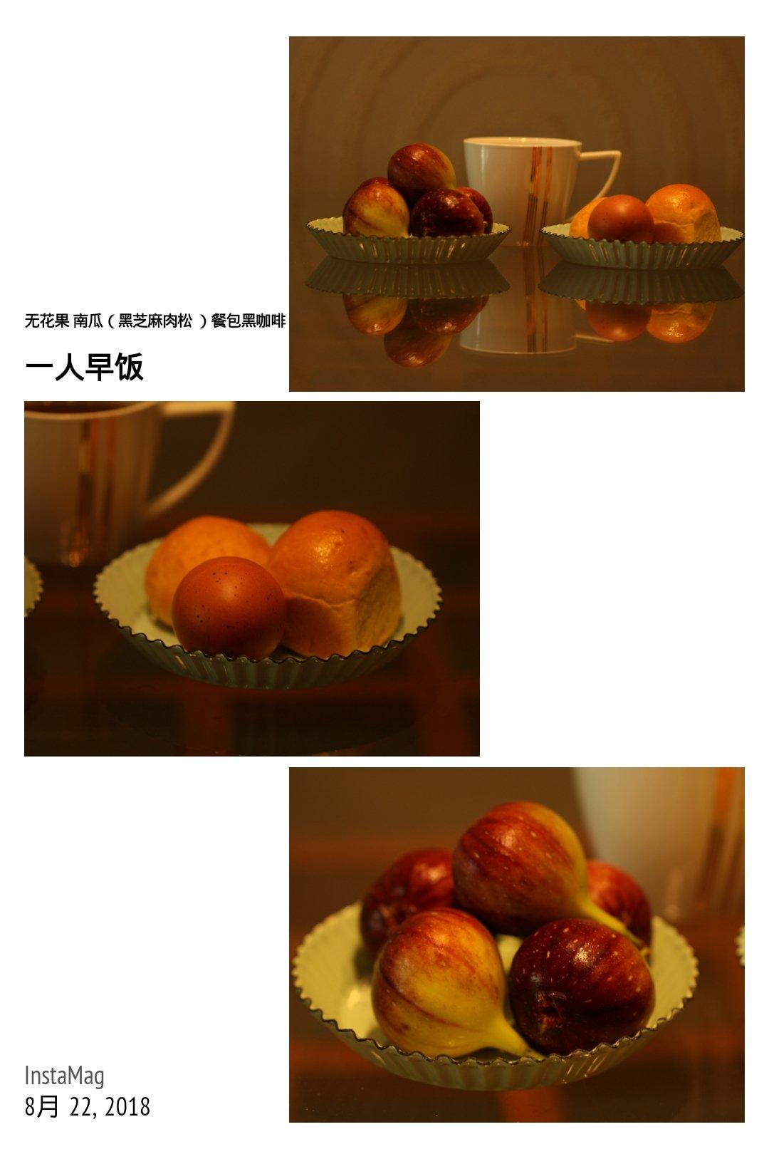一人早饭:无花果,黑咖啡,南瓜黑芝麻餐包,南瓜肉松餐包,白水煮蛋。