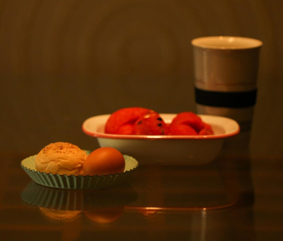一人早饭:西瓜,现磨黑咖啡,白水煮蛋,白芸豆馅餐包。
