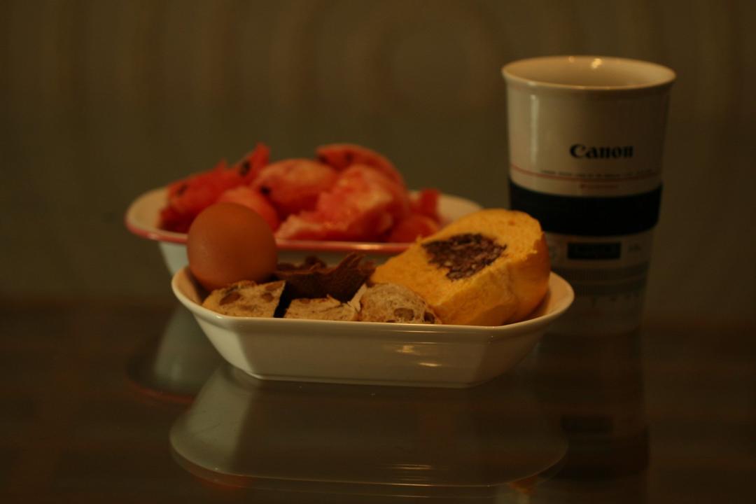 一人早饭:西瓜,无花果,白水煮蛋,胡萝卜白芸豆餐包,现磨黑咖啡。
