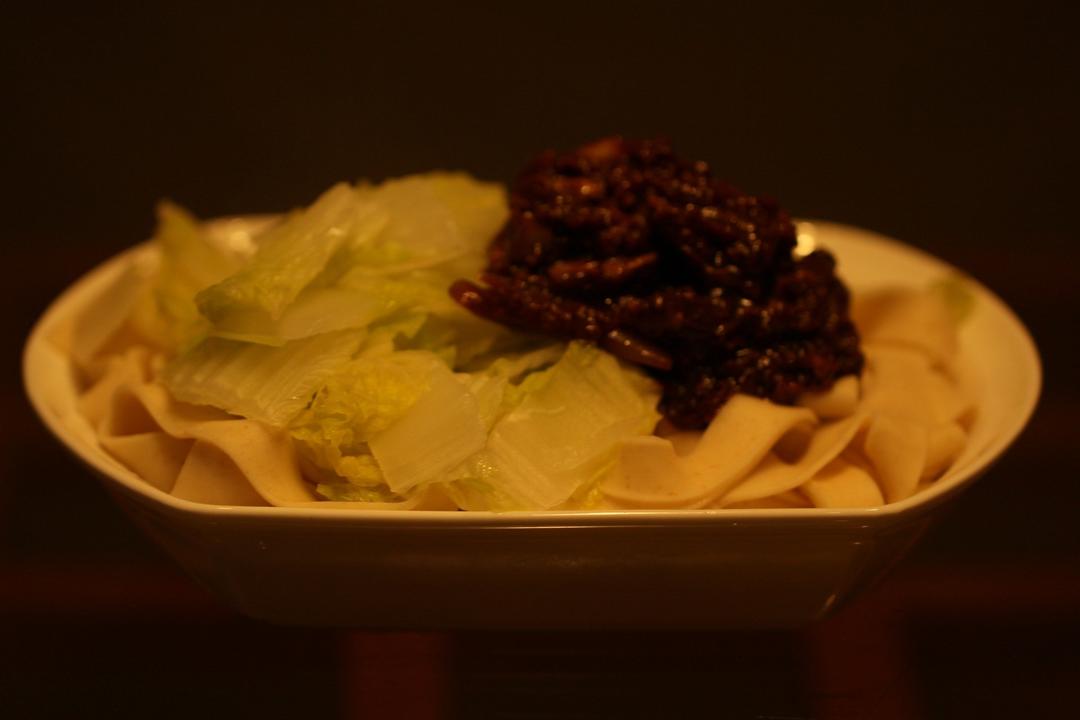 一人晚饭:存货炸酱面,搭娃娃菜,自制0.3全麦面条。