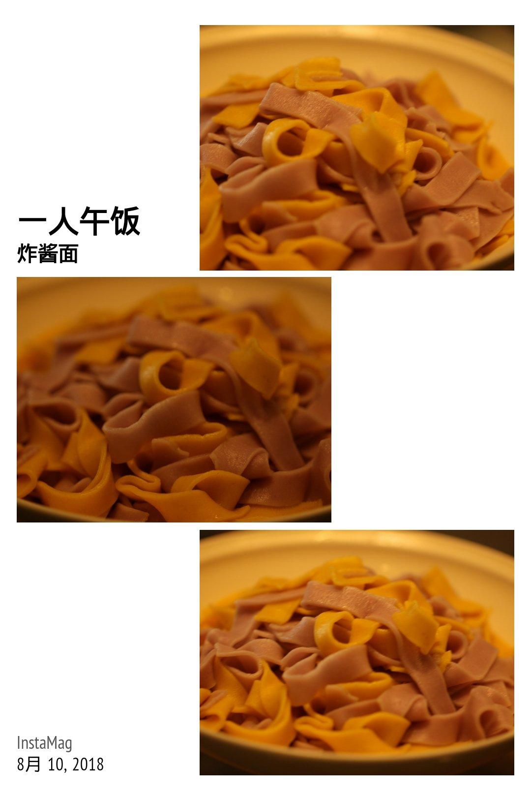 一人午饭:炸酱面,自制紫薯面条,红薯面条。