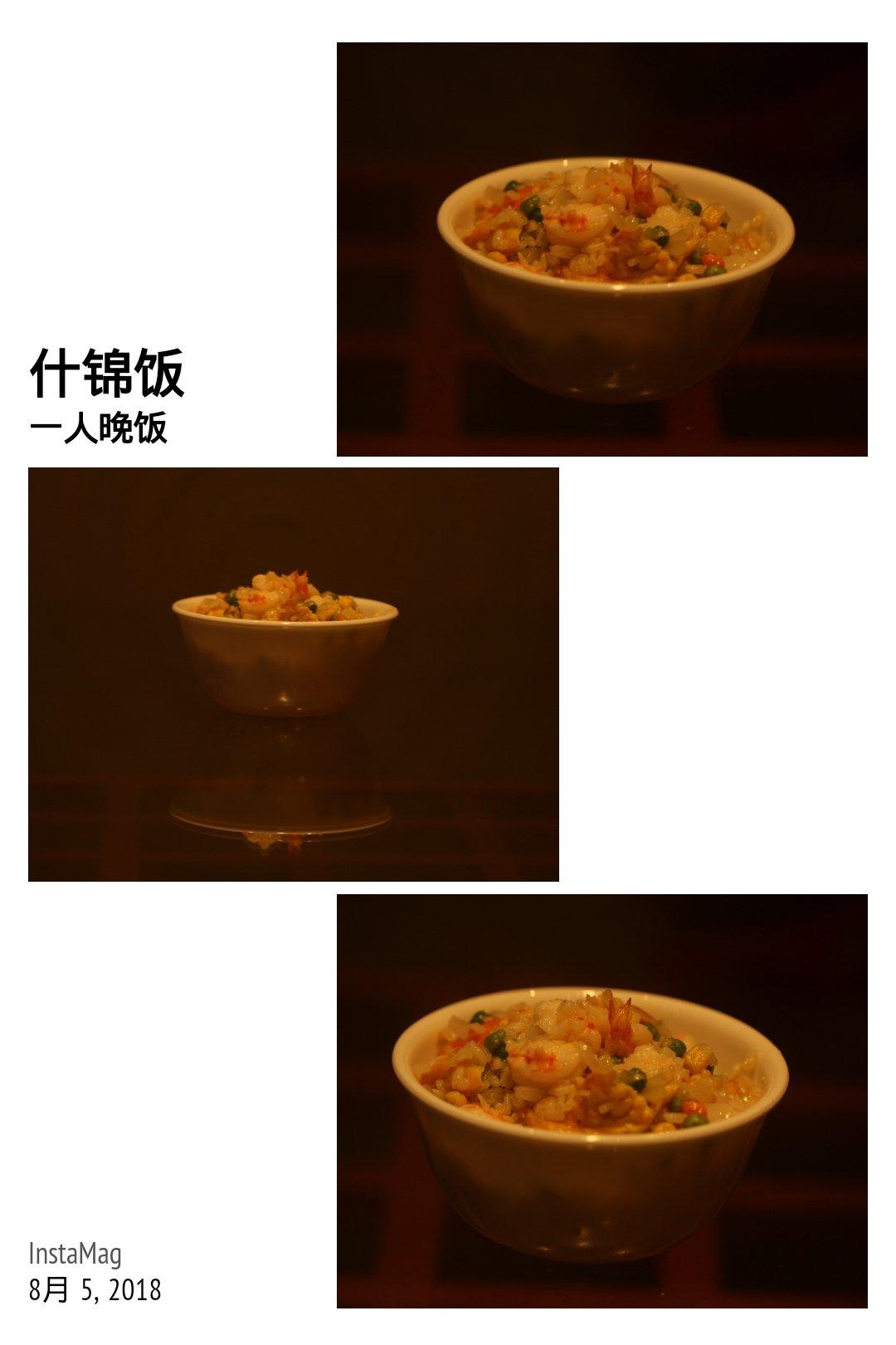 一人晚饭:什锦饭。虾仁,豌豆,甜玉米,鸡蛋,胡萝卜,洋葱。