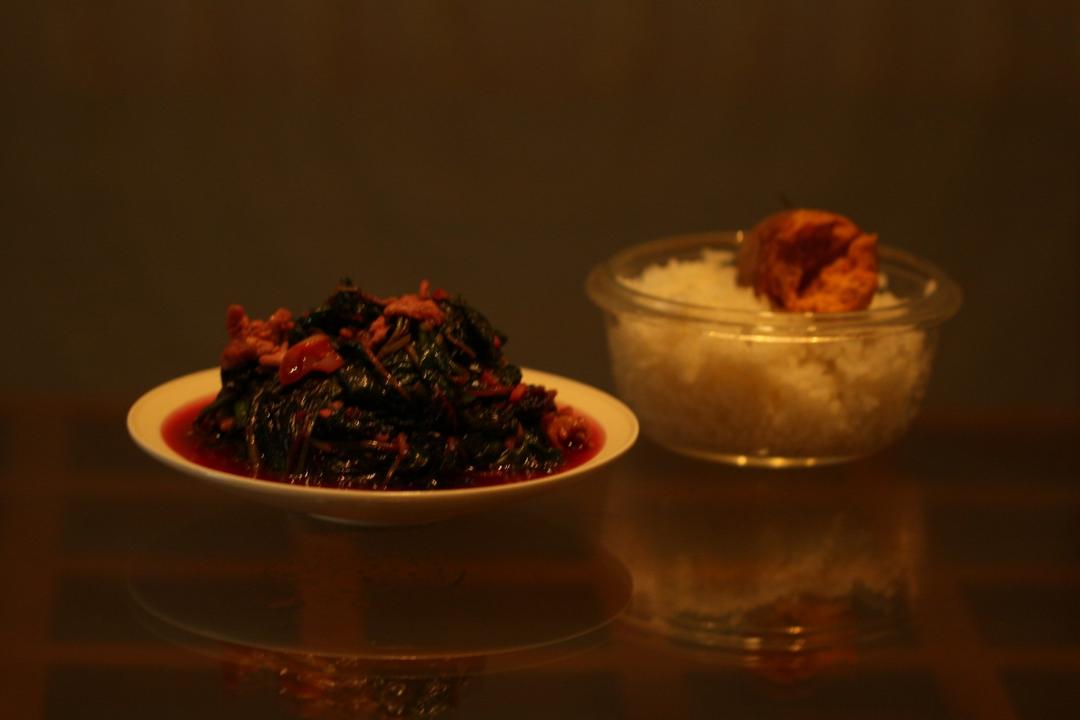 一人午饭:红苋菜炒小里脊肉片,蒸红薯,白米饭。