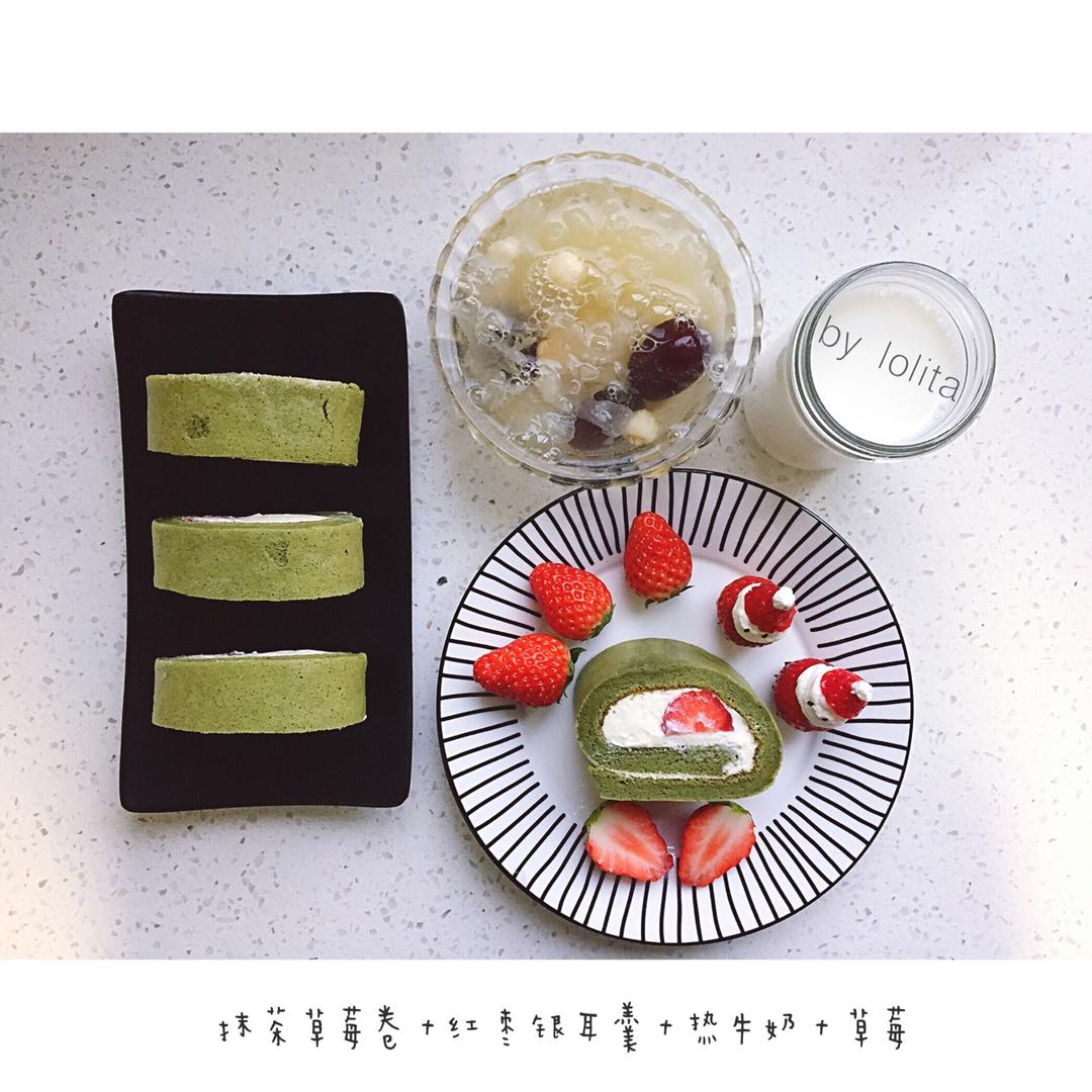 早餐:抹茶草莓卷+红枣银耳羹+热牛奶+草莓