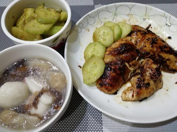 香煎鸡胸肉 拍黄瓜 紫菜肉燕鱼丸汤