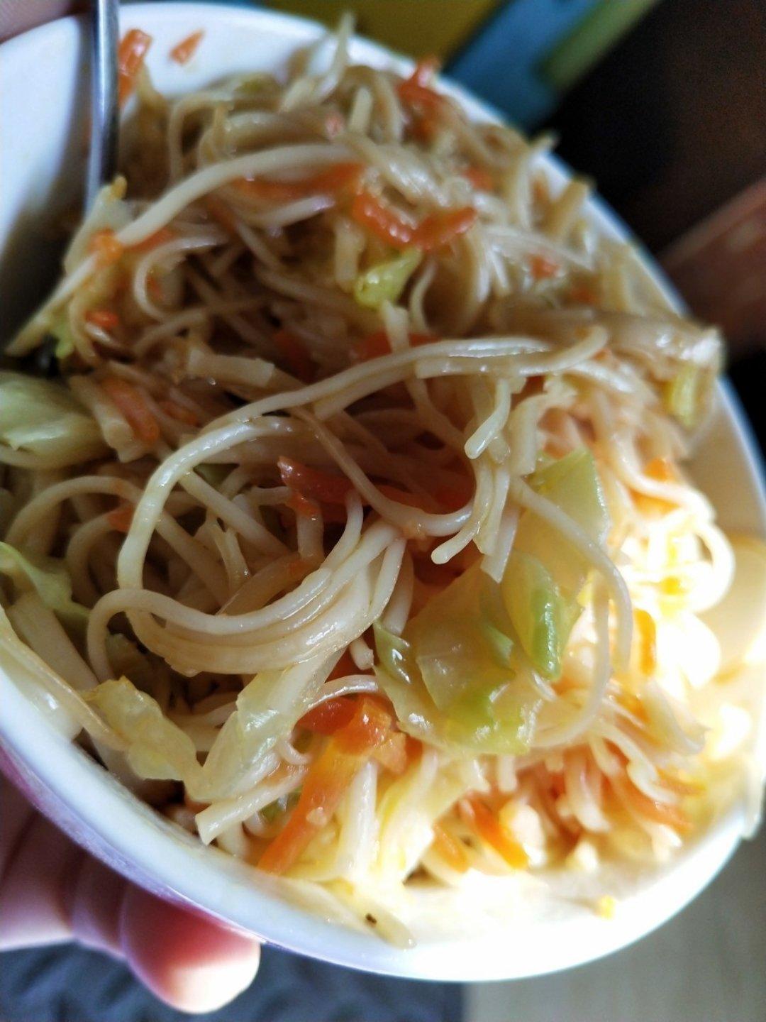 两个人的日常就是吃些简单的,本来对面条抱不大希望,炒好吃了两大碗。哈哈!