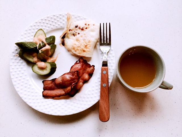 1个煎蛋,1条培根,1个青瓜拌千岛酱,1杯...