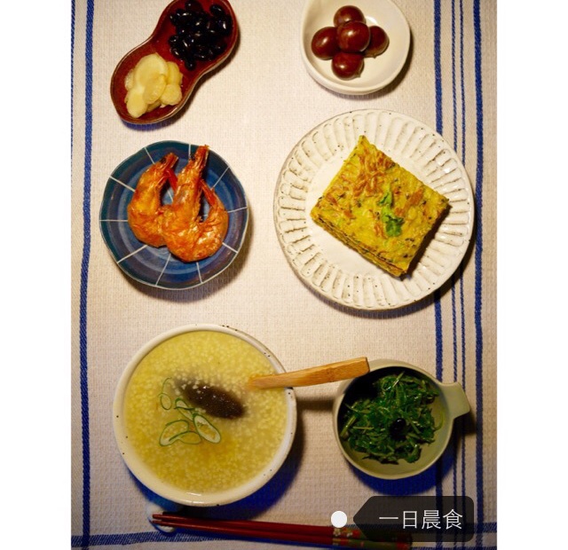 西葫芦软饼+小米海参粥+盐烤大虾+油醋汁拌豆苗+醋泡黑豆+醋泡仔姜+迁西栗子。