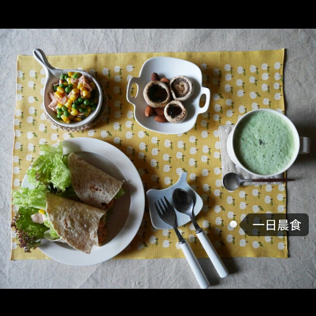 全麦卷饼配罗马生菜芝麻汁拌三文鱼玉米青豆+盐烤蘑菇大杏仁+大麦青汁牛奶。