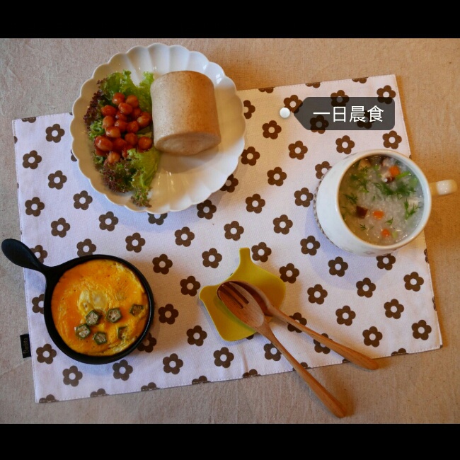 奶香黑麦卷配茄汁焗鹰嘴豆罗马生菜+秋葵煎蛋+茴香香菇胡萝卜粥。