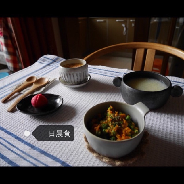 二米粥+樱花虾炖蛋+金瓜焗青豆+樱桃萝卜渍。