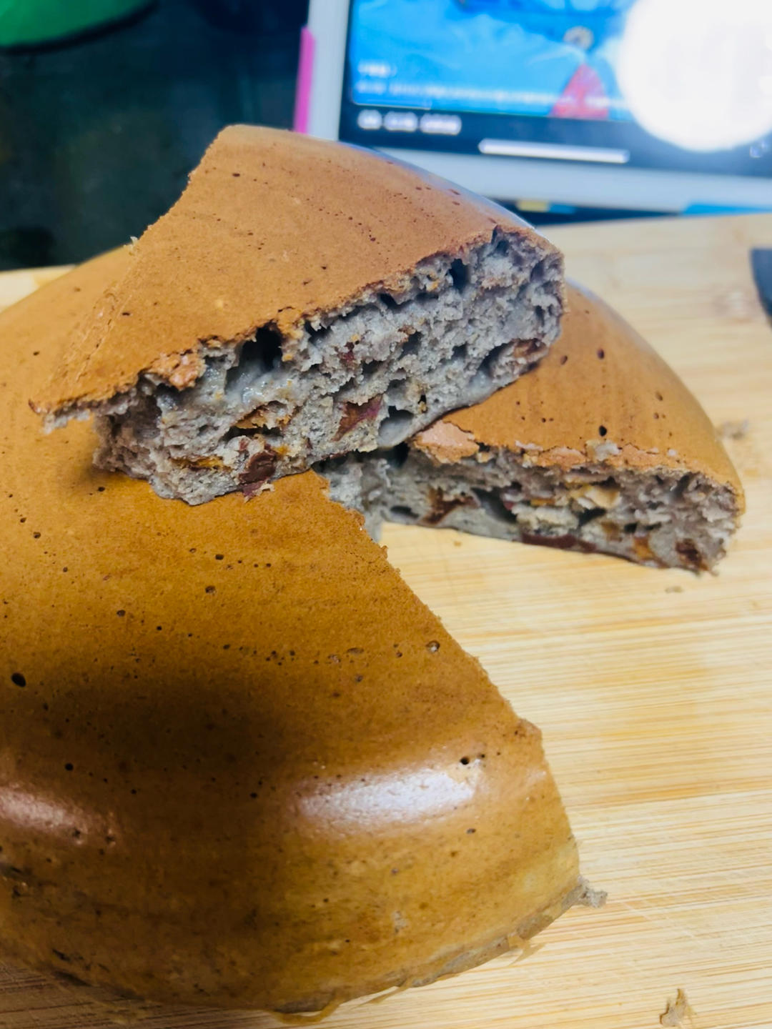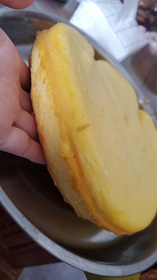 牛奶跟面粉比用量表多下了一点,热锅五分钟底部刷油,然后倒进去振三下,直接按蛋糕键煮好拿出来振三下倒扣。电饭煲煮方便多了。...