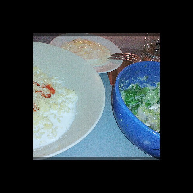 意面+creme+番茄酱。意式沙拉,荷包蛋