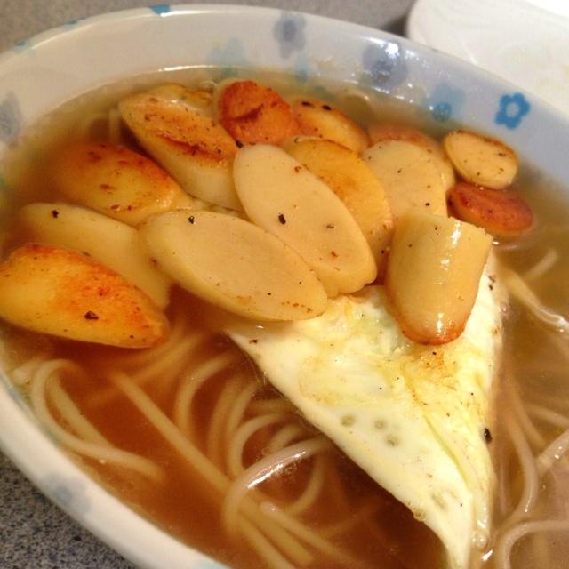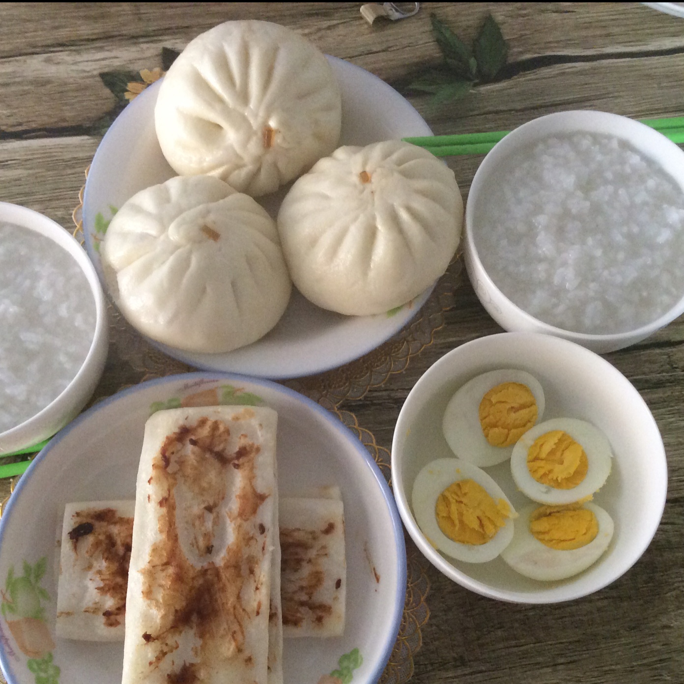 咸菜粉丝包,烤年糕,鸡蛋,白粥。