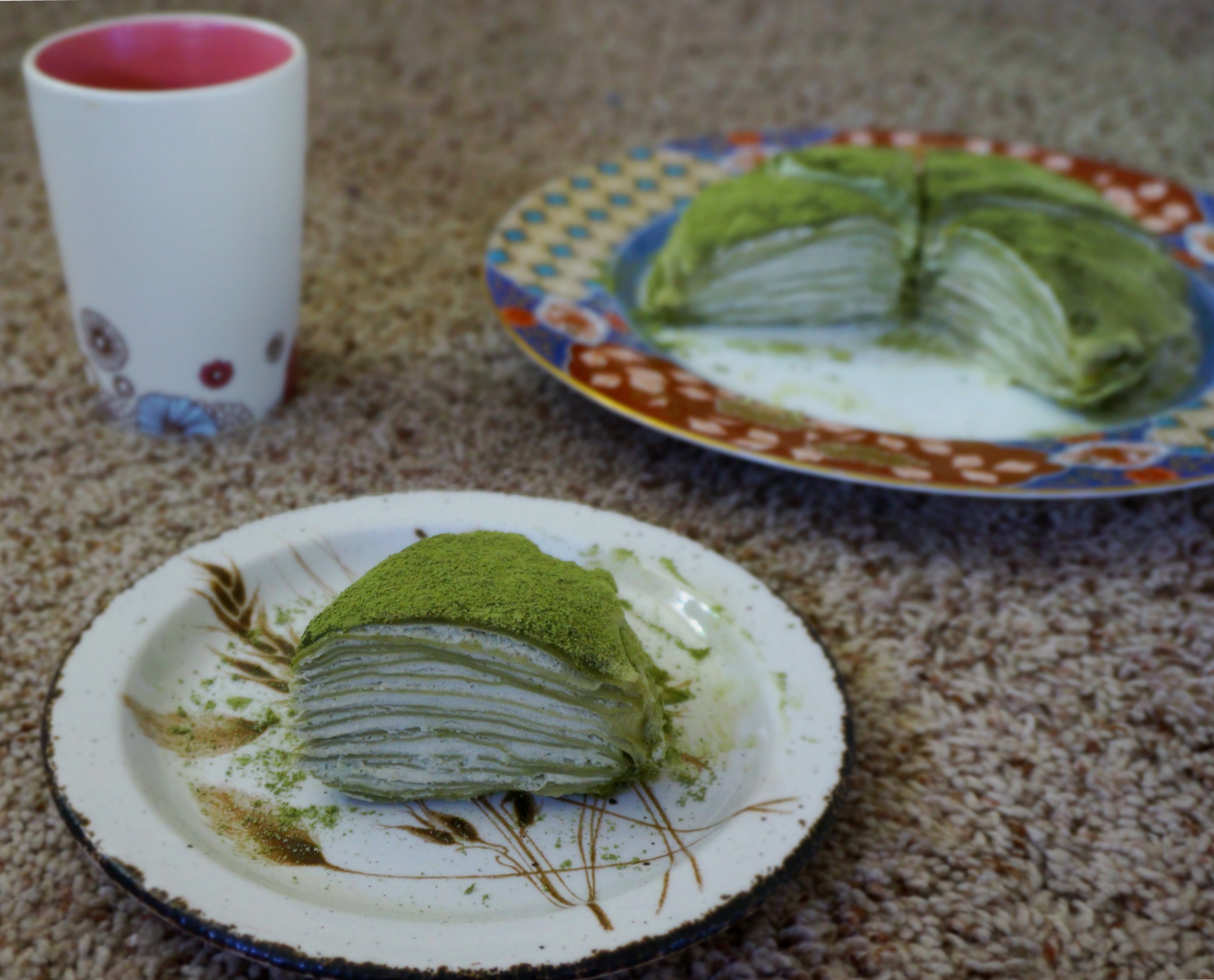 早上赶时间 分量减半摊了15张 丢掉了长得丑的前两张 奶油是前一天抹茶蛋糕剩下的 不多了 所以整个饼都好薄