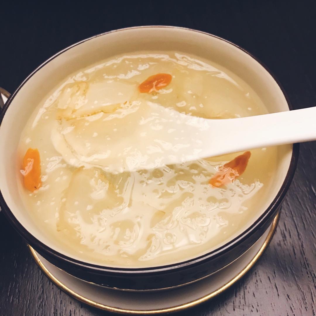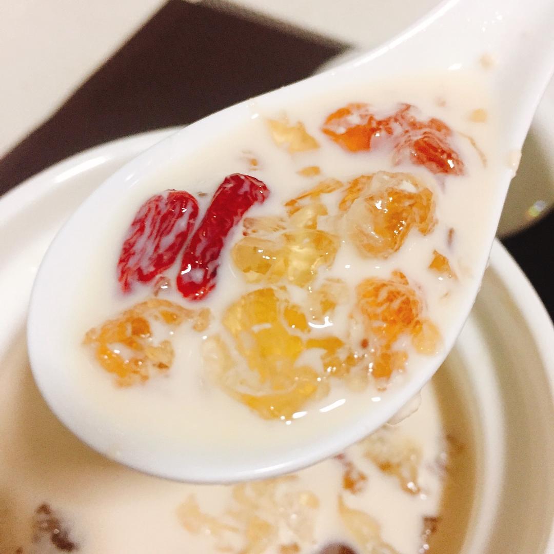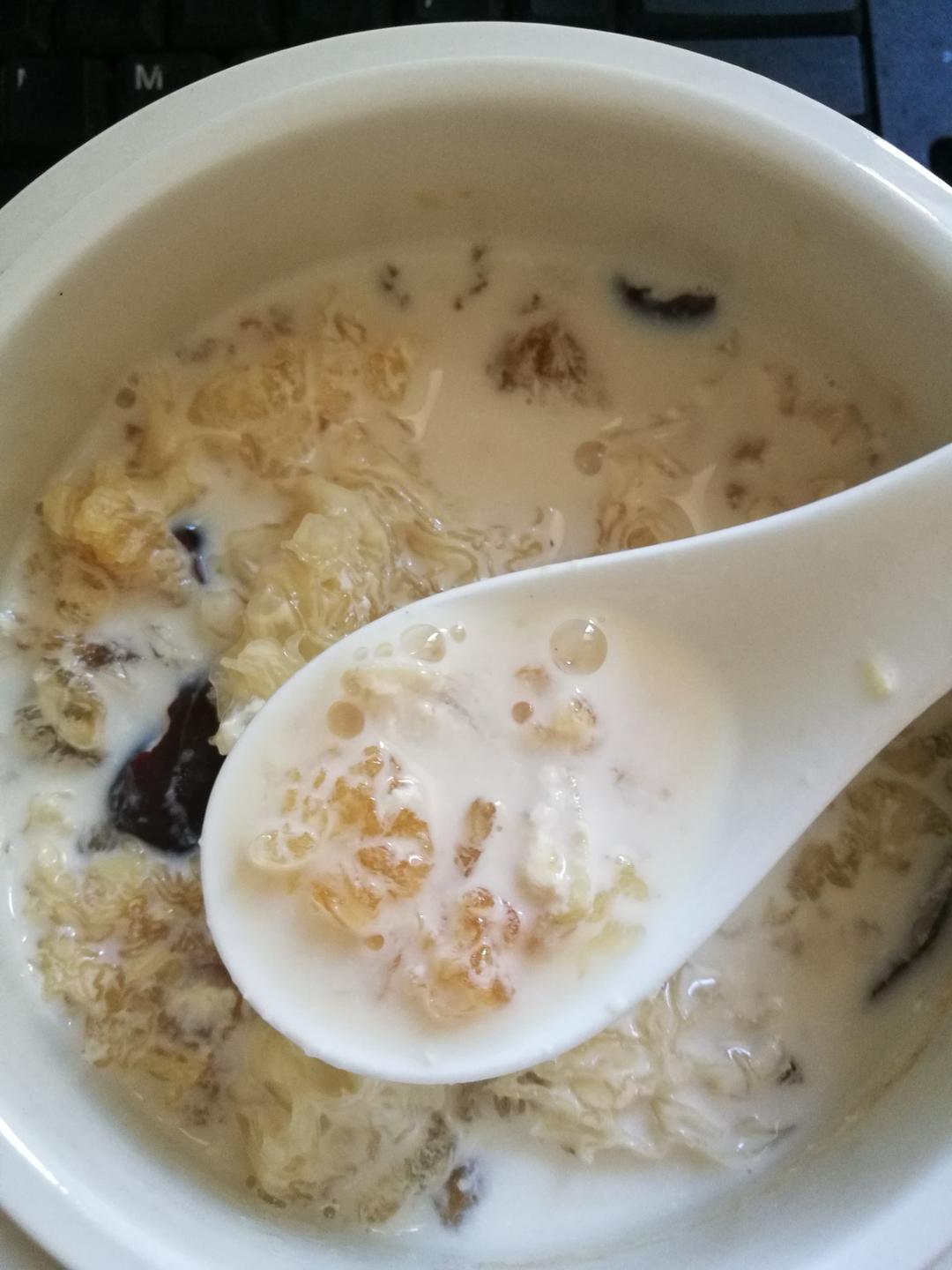 第一次做,还不错,桃胶泡了12+小时,忘记捏碎了有的是块状的。