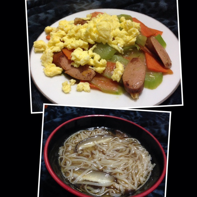 妞周五早餐:蘑菇阳春面、红萝卜青瓜炒火腿肠、炒鸡蛋。