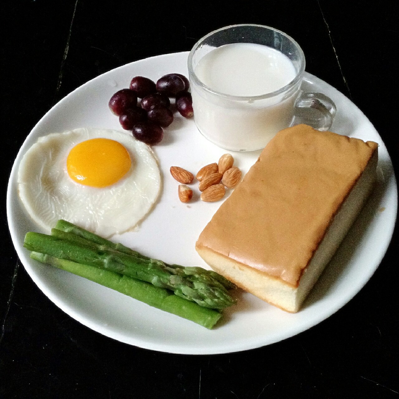 今日早餐:蜂蜜蛋糕+白灼芦笋+太阳蛋+低脂牛奶+杏仁+提子…