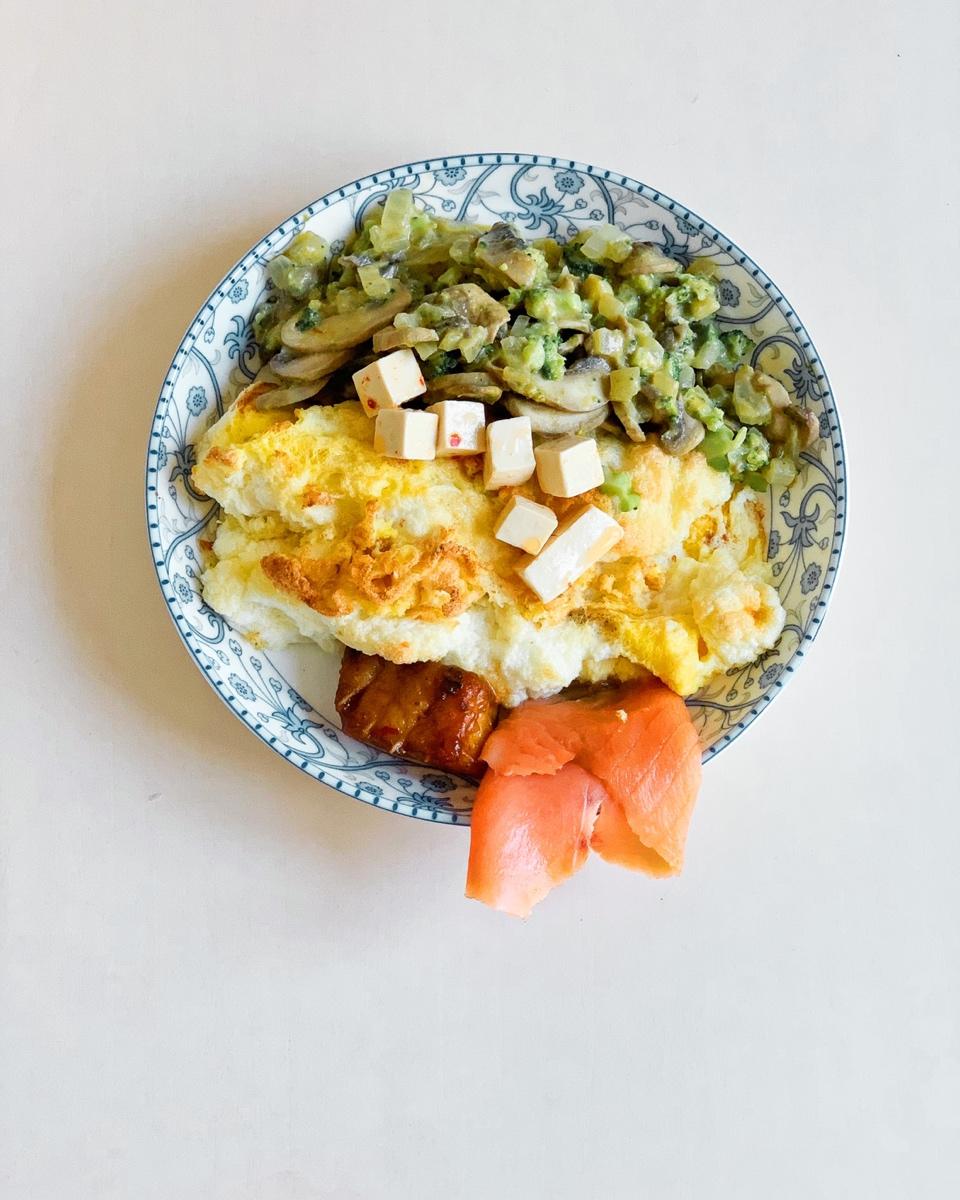 咖喱炒什蔬,蛋饼想弄得又圆又蓬又不粘锅真的好难😂烟熏三文鱼一片,一块昨晚从Ritz 打包回来的鳕鱼。。#早餐•2019年...