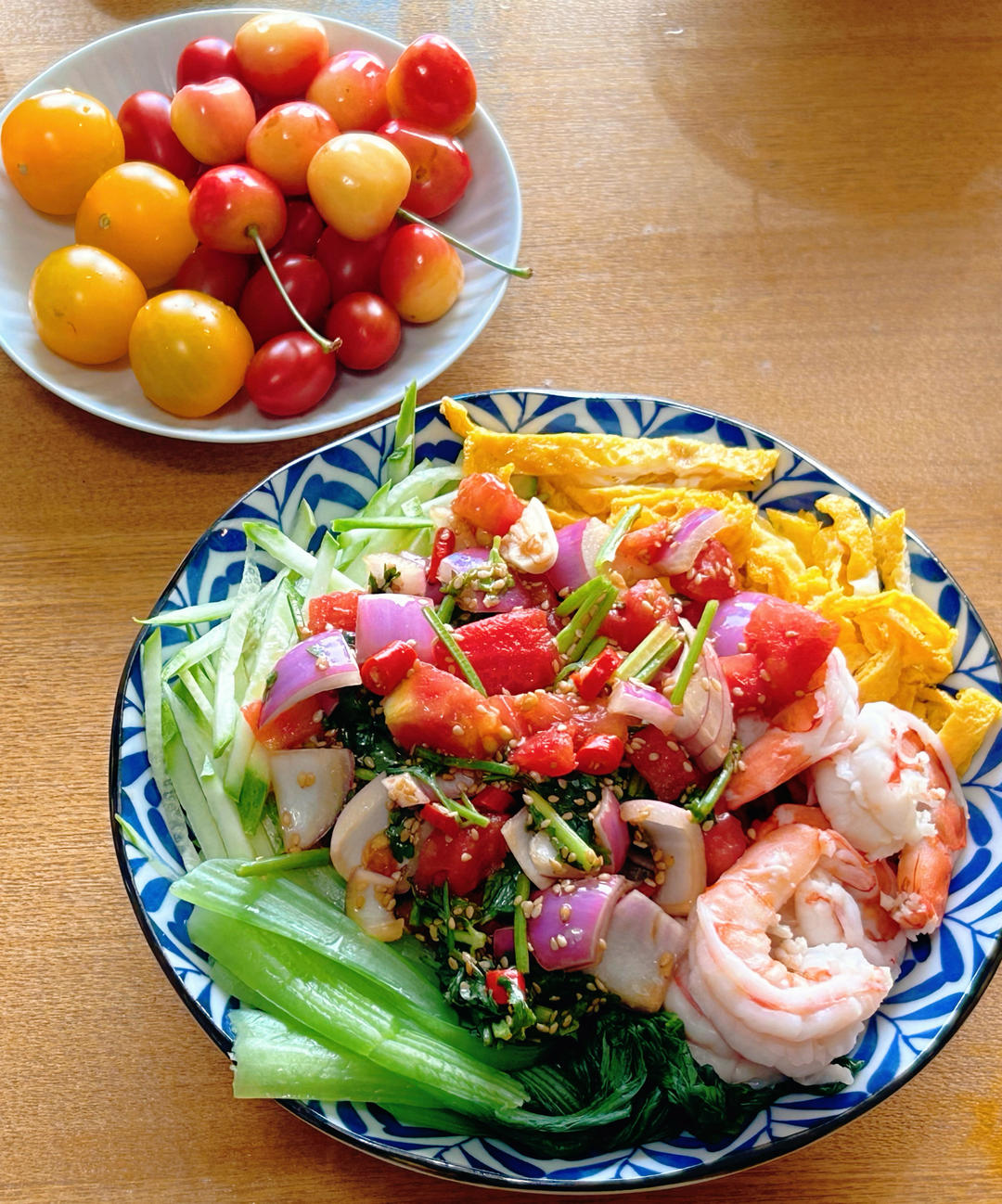 西葫芦炒虾仁 亚麻籽无糖面包 奶酪 樱桃 甜杏 柠檬蜂蜜水
