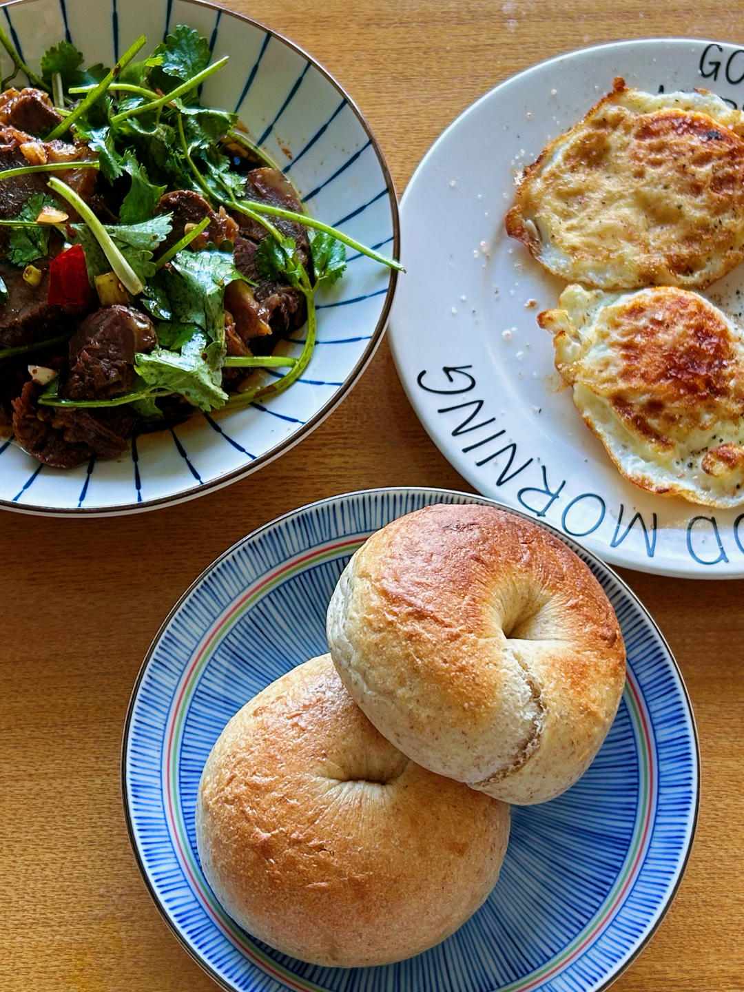 周末的早饭:贝果 煎蛋 拌牛肉