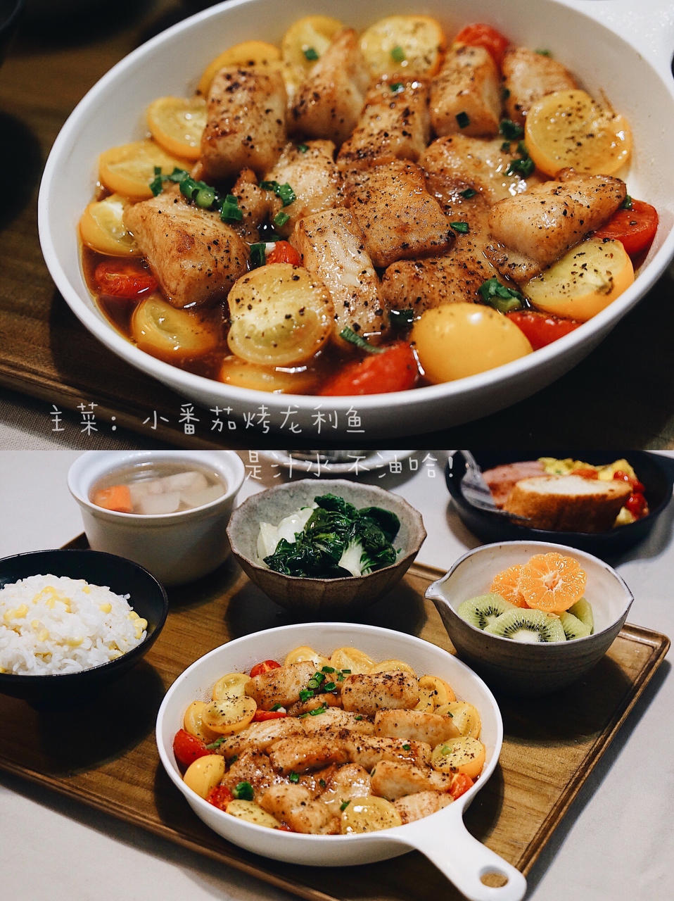 今日套餐:小番茄烤龙利鱼、萝卜骨头汤、奶白菜、水果