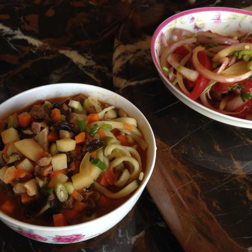 新疆汤饭,糖蒜作伴。