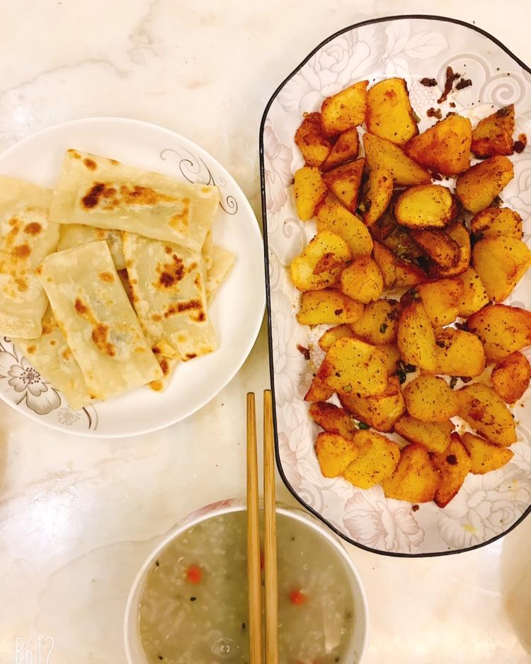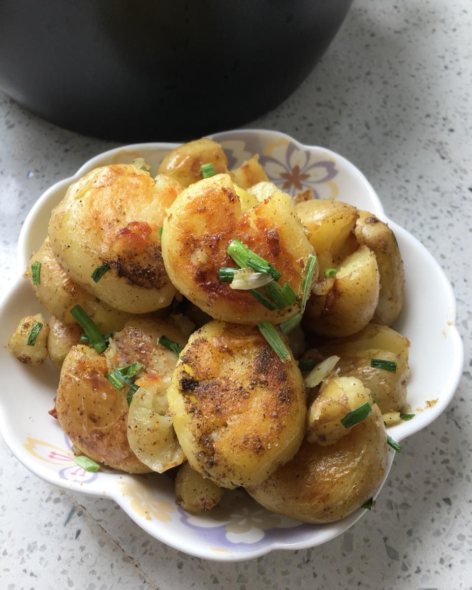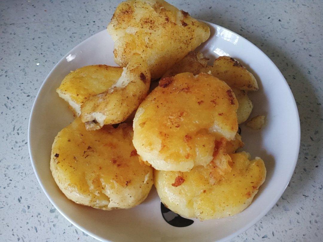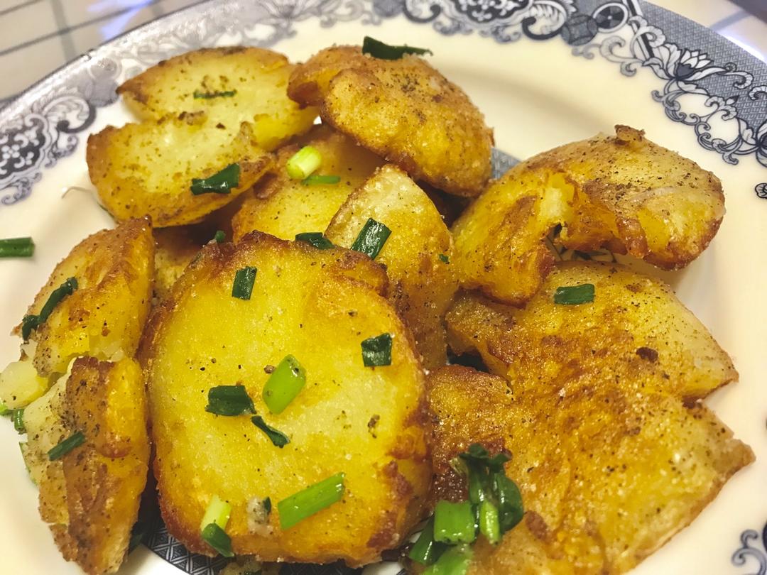油要稍微多一些,有耐心,小火慢煎,没有孜然,用了胡椒粉,辣椒,盐,香葱,味道也非常美👌