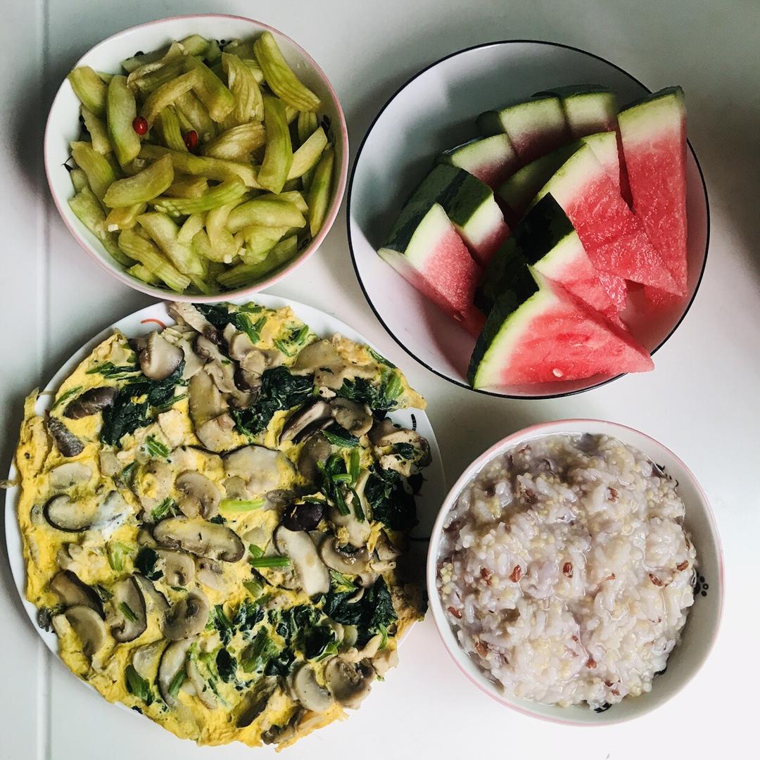 昨晚小学生挖西瓜吃剩的西瓜皮一夜渍,脆脆的很爽口,配粥再好不过。给小学生做了双菇菠菜鸡肉烘蛋,一个人消灭干净了,完美一餐...