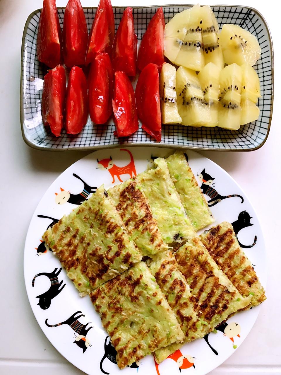 早餐马拉松D15,西葫芦+燕麦片+全麦粉+鸡蛋,简单美味。小学生挤上番茄酱吃的也挺欢快~