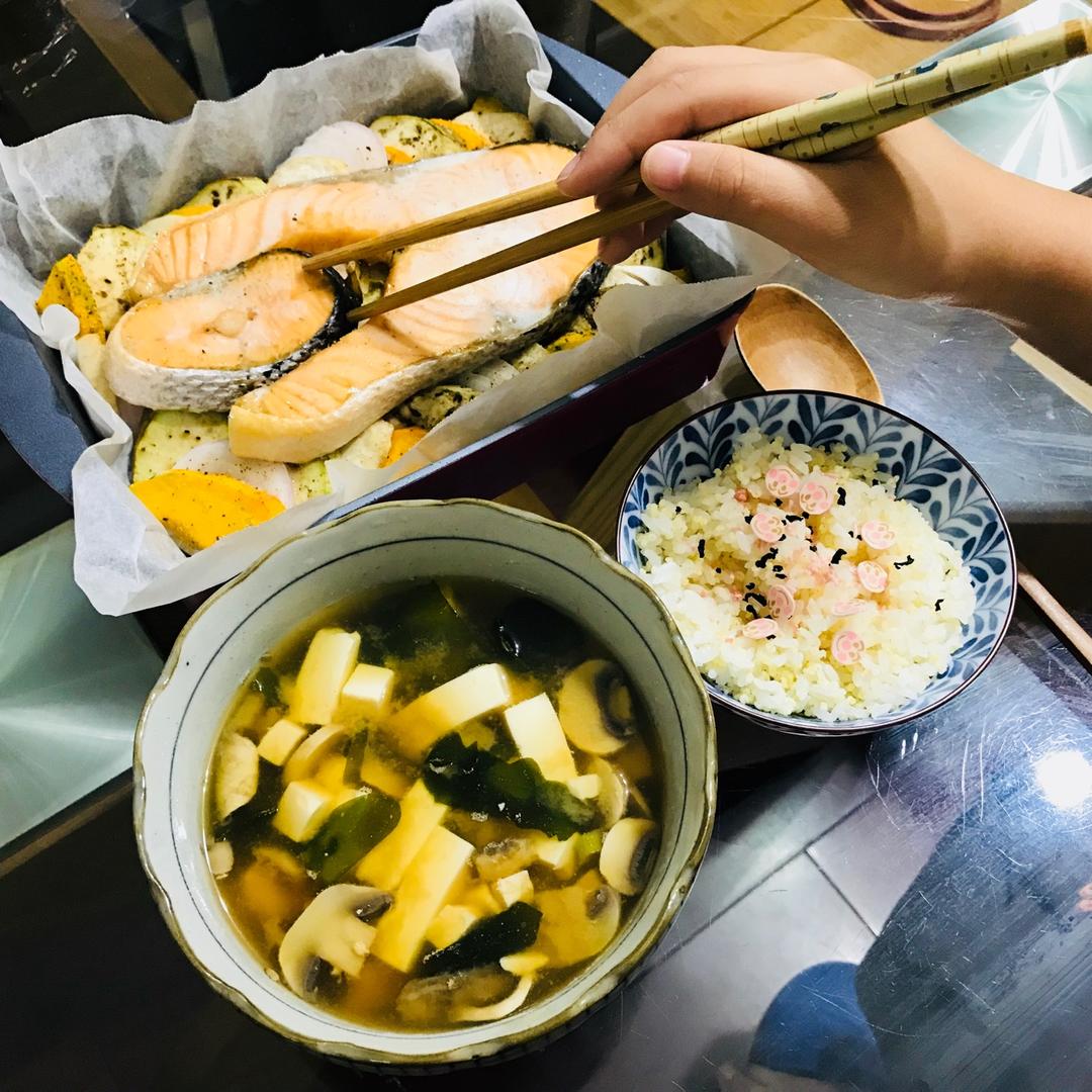 小学生前天晚上就预定的标准日式早餐套装:烤三文鱼+味增汤+白米饭