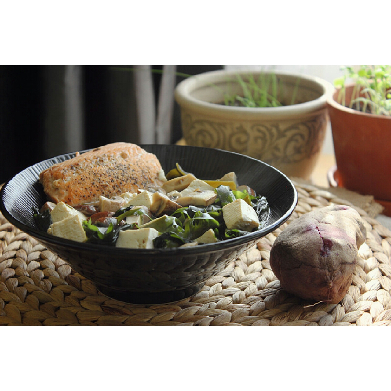 三文鱼味增乱煮,豆腐蘑菇菠菜和紫薯。试了韩国海带汤海带和日本昆...