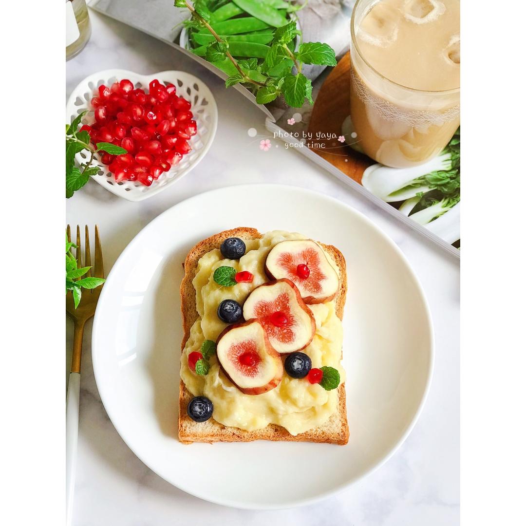 今日份+事物:①今天的早餐有点任性:开放式榴莲三明治🥪(吐司+厚厚的一层冰榴莲泥+无花果+蓝莓+石榴),吐司可以稍微烤一...