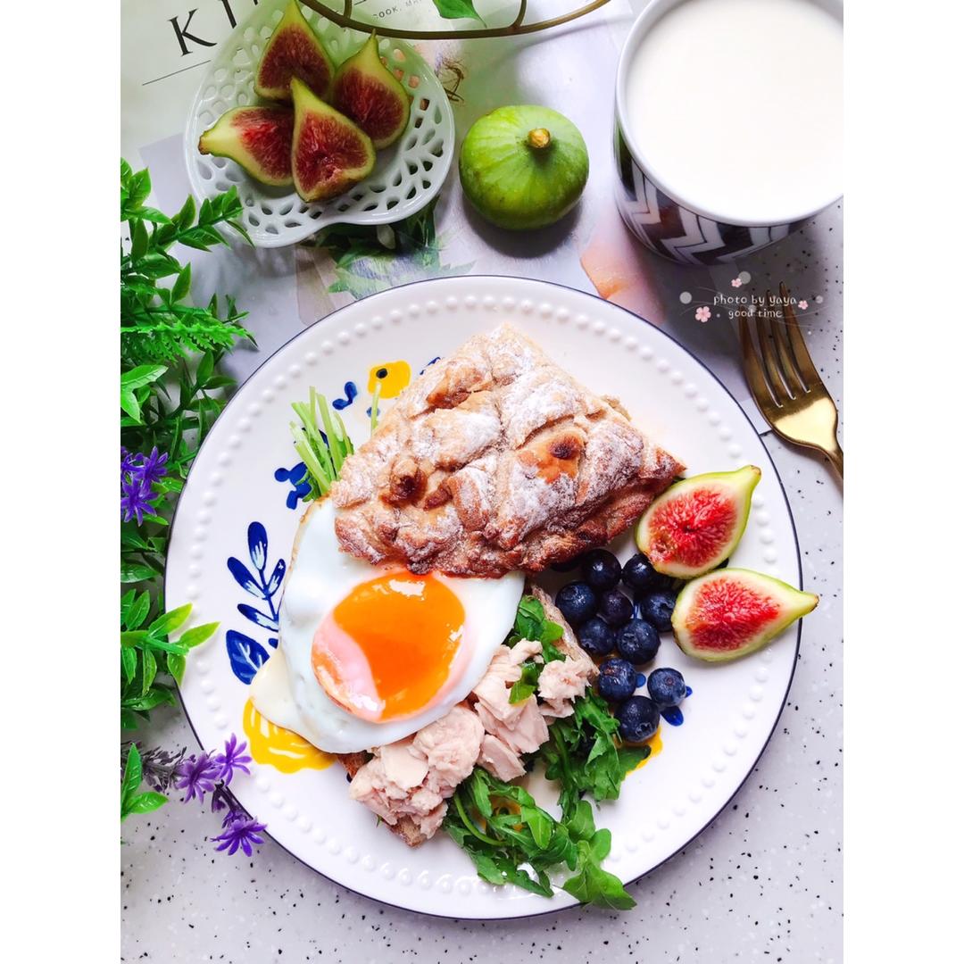 今日份+事物:①今日早餐:自制葡萄干黑麦软欧+芝麻菜+金枪鱼+煎鸡蛋🍳三明治🥪,蓝莓,无花果,百菲酪水牛奶🥛。②今天天气...