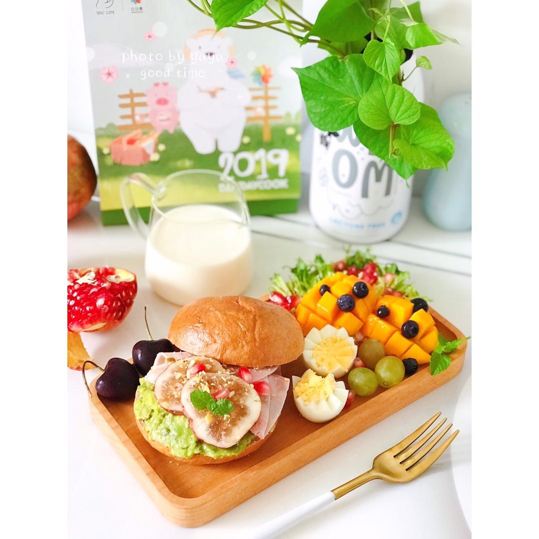 今日份+事物:①今日早餐:贝果+牛油果泥+美式火腿片+无花果+坚果碎三明治🥪,水煮蛋🥚,苦菊+芒果+葡萄+蓝莓+石榴+车...