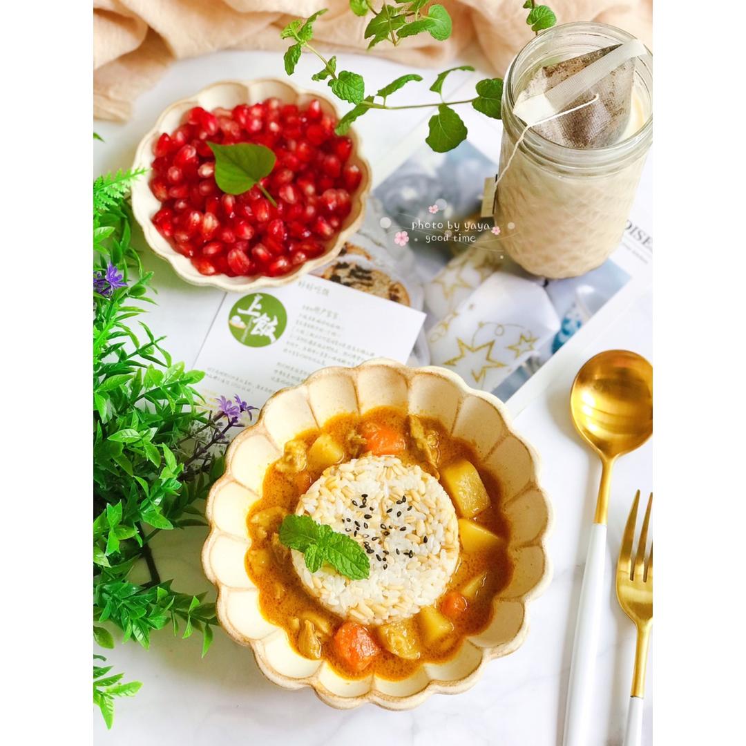 今日份+事物:①今日早餐:胚芽燕麦米饭佐咖喱鸡,冷萃奶咖,石榴。额,早上吃米饭好像不是我的风格,可是已经连续早餐打卡40...