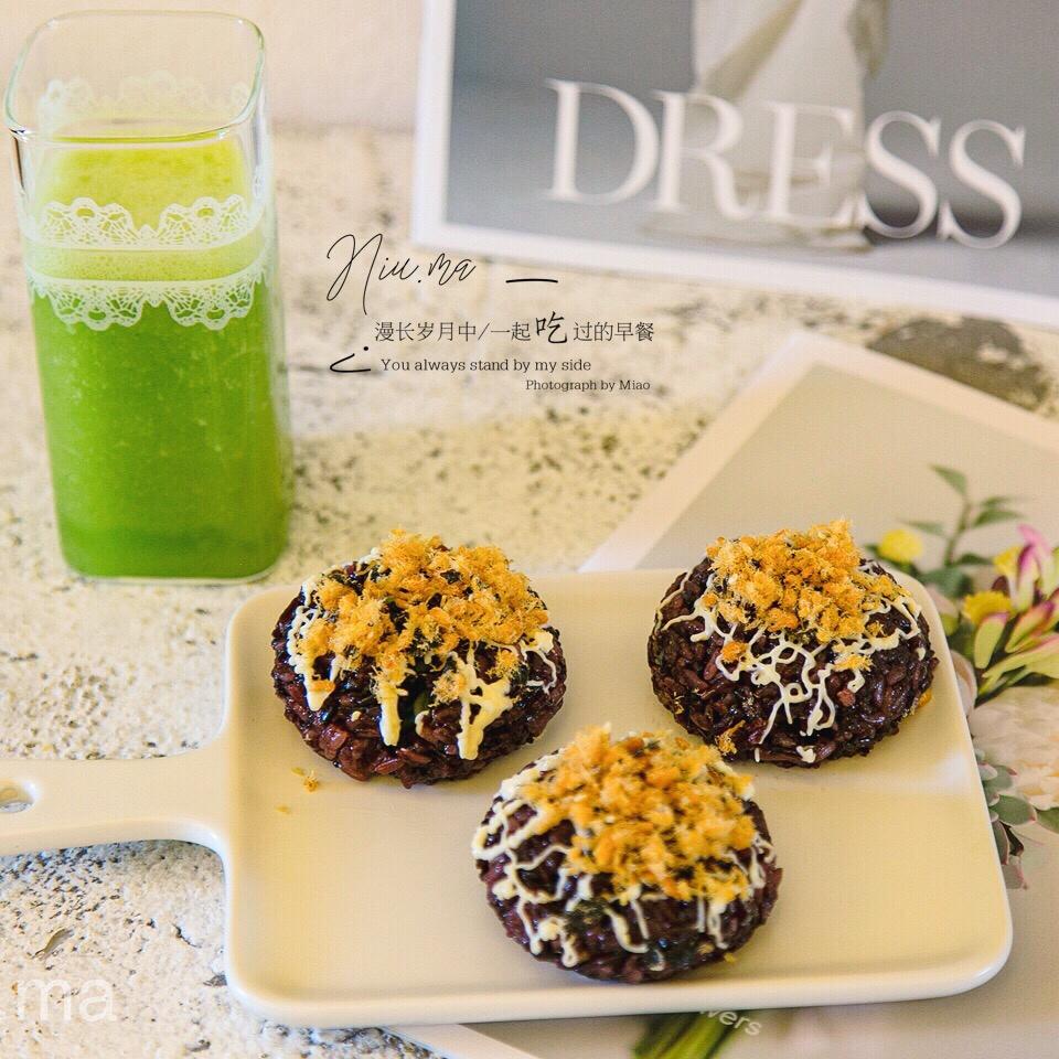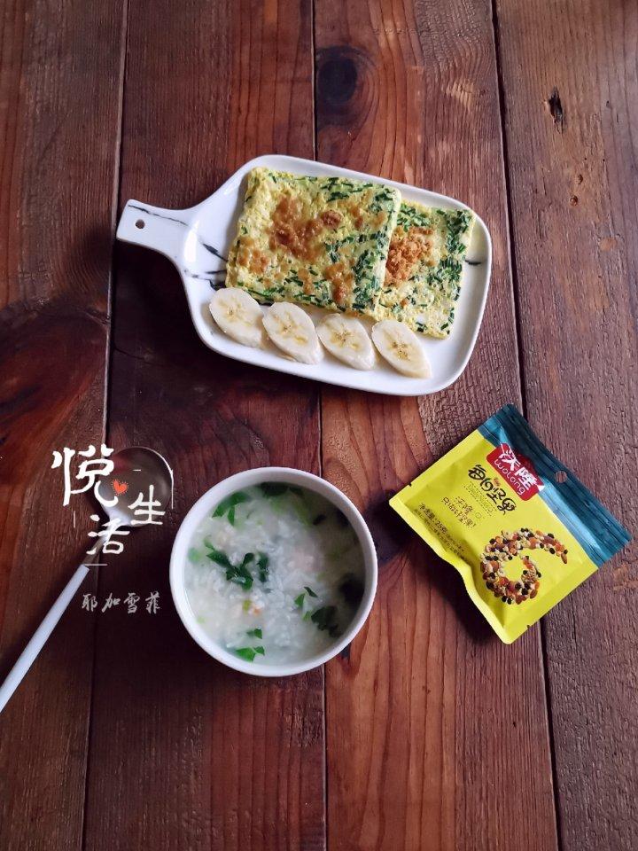 早安🍀 今天用三明治机做了鸡蛋肉松饼,配上鲜虾青菜粥🦐