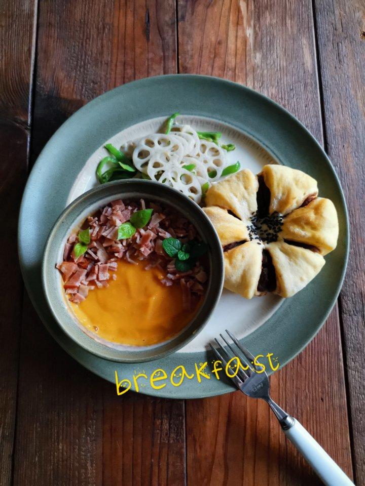早安🍀又到了南瓜季🎃 来碗暖暖的南瓜浓汤,自己做的南瓜面包,清炒藕片!