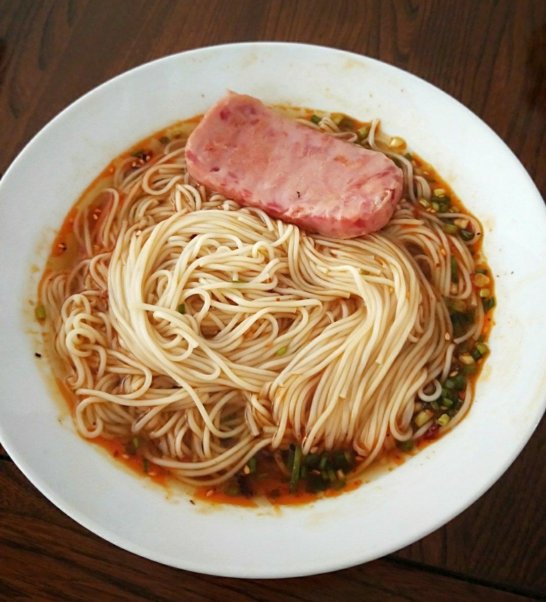 抱姐给自己煮了麻辣小面,加了一块厚厚的午餐肉😂 😂
