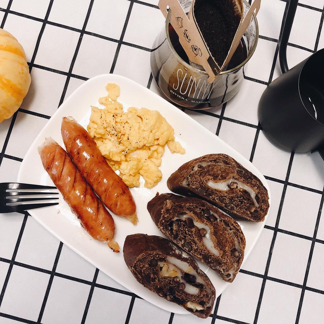 太久没晒早餐了~昨天做的可可麻薯欧包~好吃~